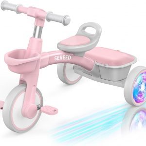 SEREED Colorful Lighting Toddler Tricycle for 2-5 Years Old Girls, Adjustable Seat&Handlebar Trike, Removable Basket