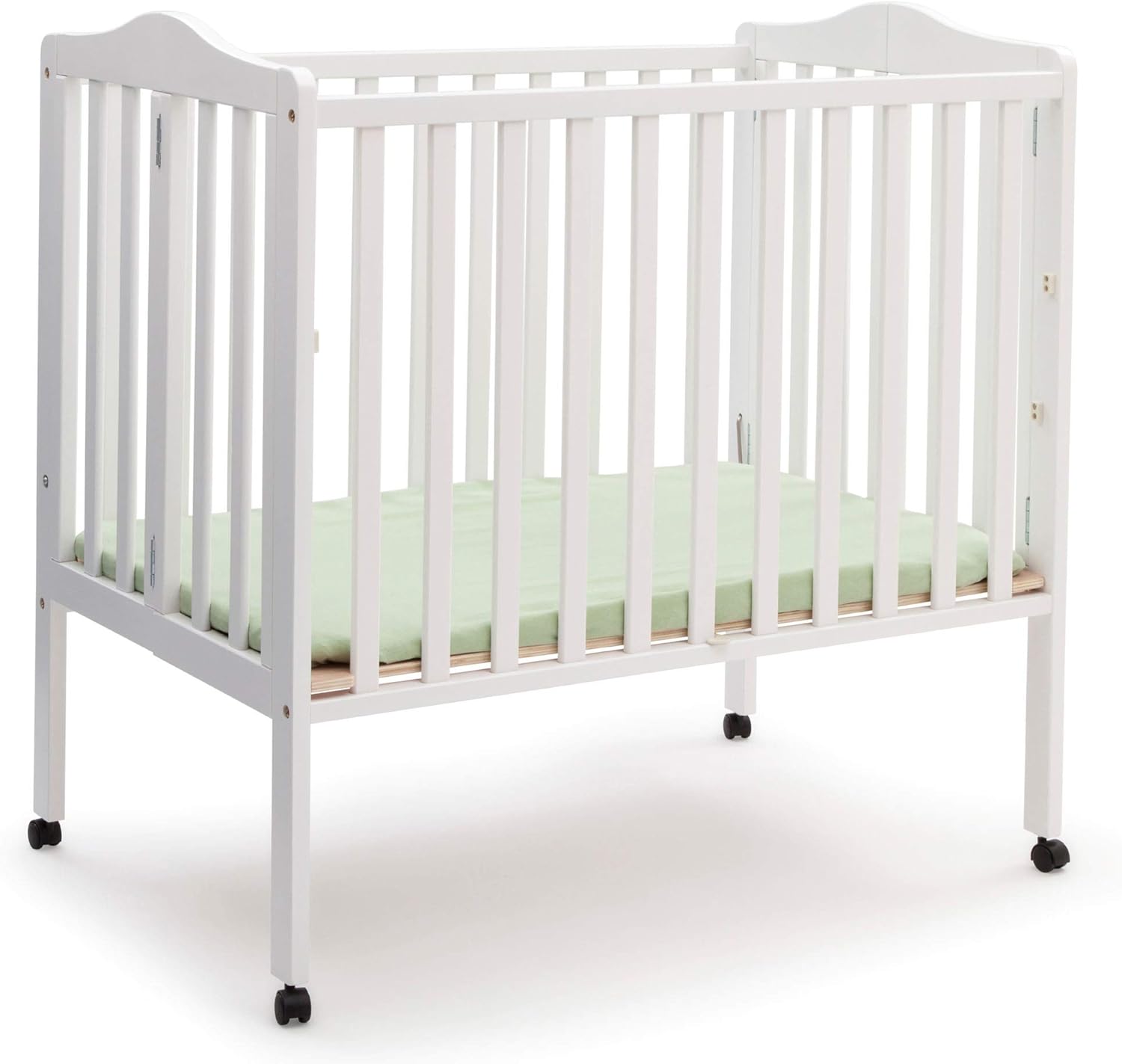 - GREAT CRIB FOR SMALL SPACES OR TRAVEL: Crib includes casters for easy mobility; Folds flat for easy travel and storage; The included mattress (size: 37.5″L x 23.25″D x 1.5″) stores right in the crib when folded